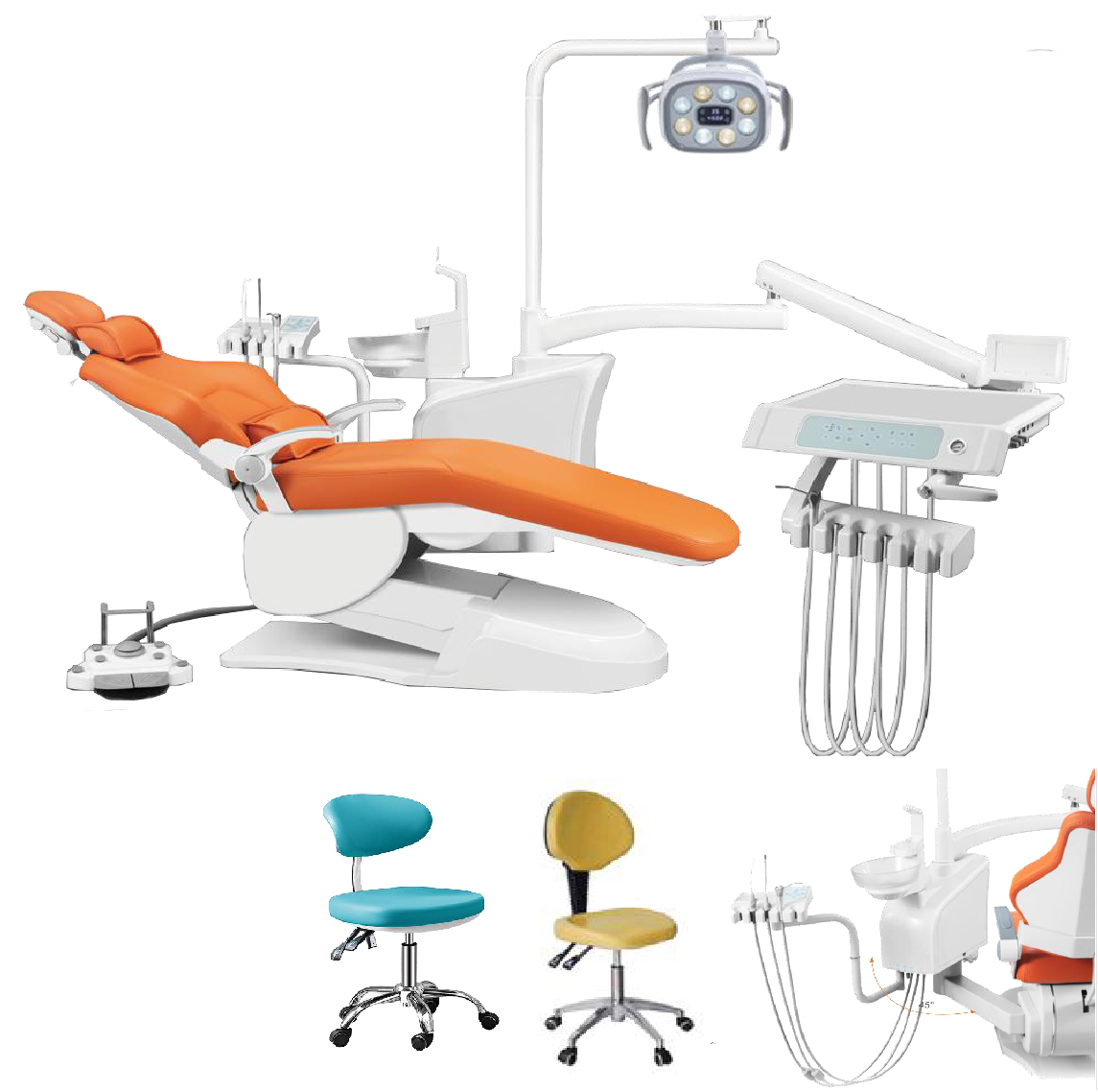 The D30 dental unit delivers a perfect blend of innovation and ergonomics to enhance the dental workflow. It features a water heating system, rotary and 90° rotatable side boxes, and a spittoon with flushing and cup filling functions for optimal hygiene. The unit comes with an LED film viewer, an 8-bead oral lamp with sensor, and a moving instrument trolley with air brake to streamline operations. Its chair movement system offers 9 memory positions, while the assistant control panel and multifunctional foot pedal allow precise, hands-free control. Additional features include pure water bottles, a dentist stool with backrest, and imported inner tubing, all designed to improve convenience, comfort, and efficiency in dental procedures.